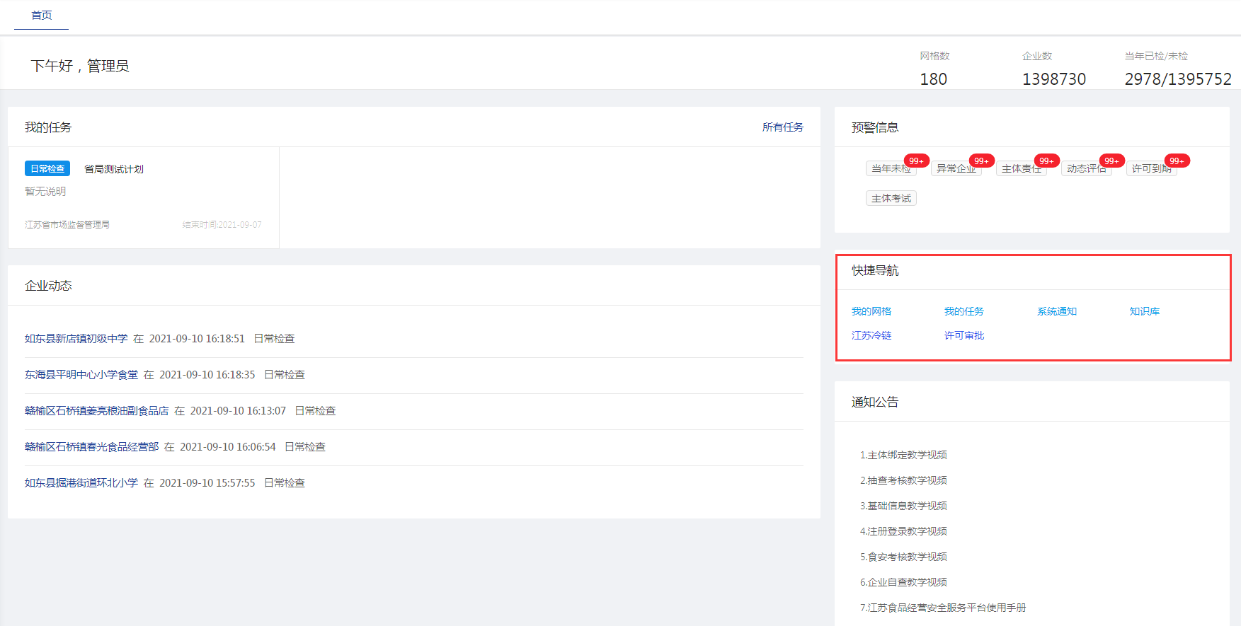 【快捷导航】部分提供各种较常使用菜单的快捷导航,点击需要使用的菜单名可以直接打开对应菜单。还提供江苏冷链系统以及食品经营许可审批系统的快捷导航。