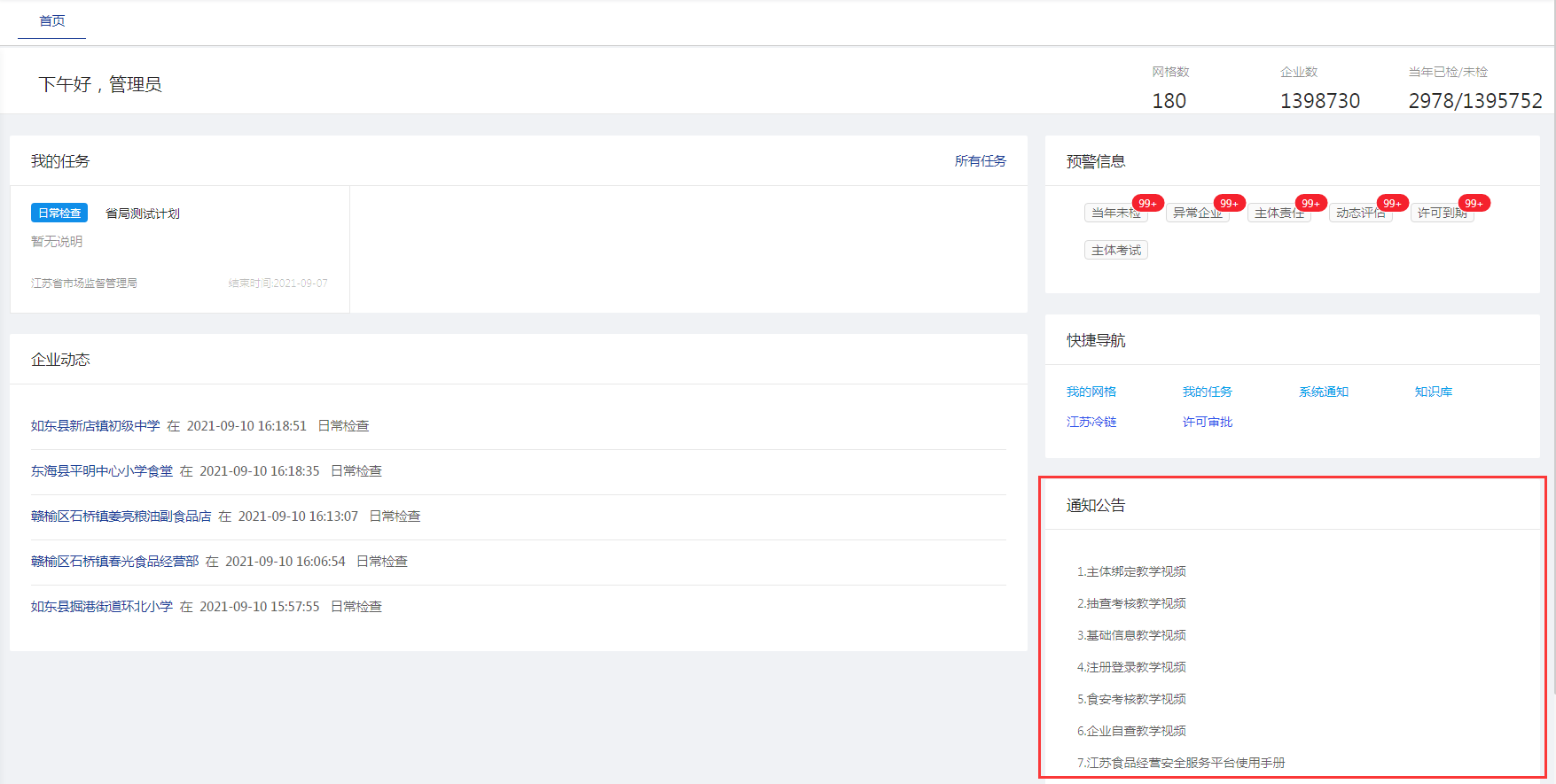 【通知公告】部分展示系统发布的各种通知通告消息。点击详情可以查看详细的通知内容。