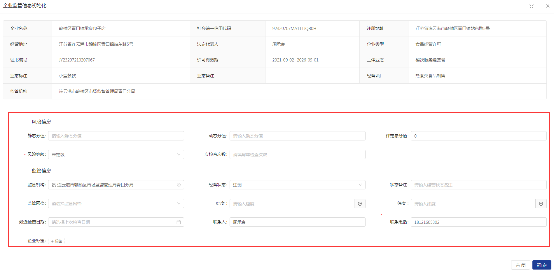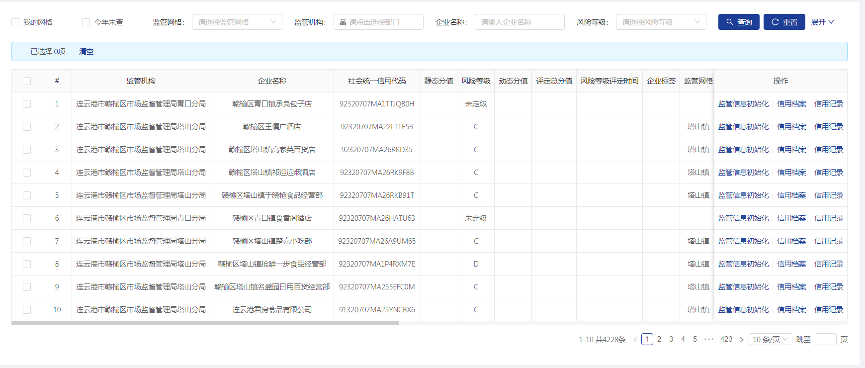 与主体信息菜单一样,列表最后的监管信息初始化按钮可以对企业的监管信息进行初始化调整。