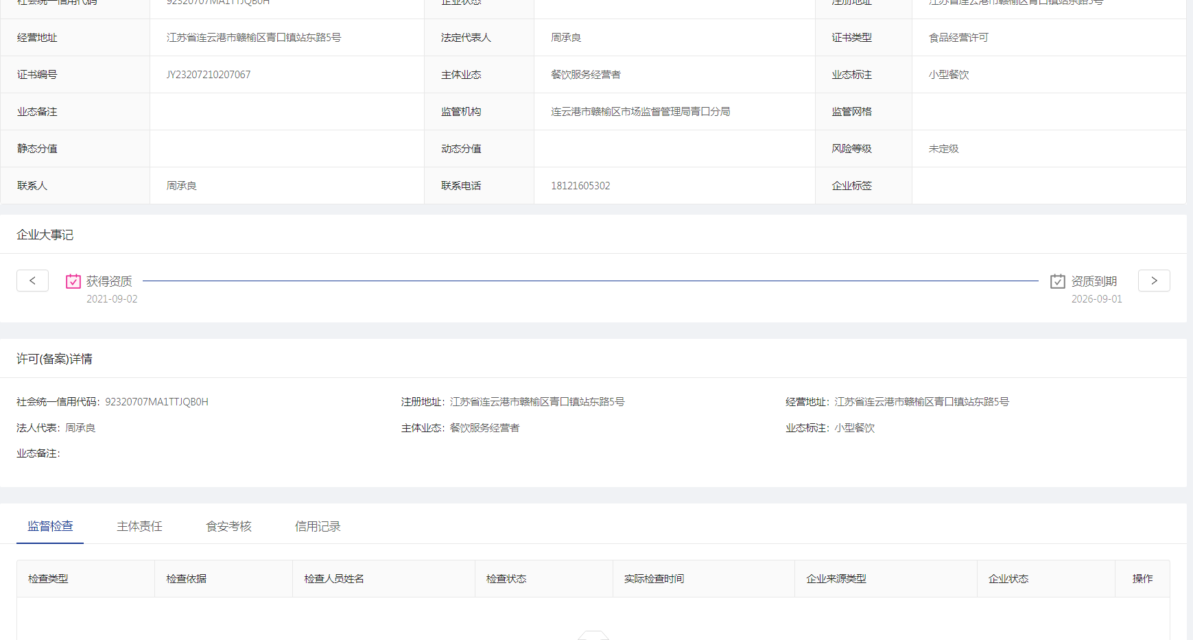信用档案菜单可以查看主体详情界面,显示企业的主体风险信息、许可(备案)详情、近五年检查记录以及主体责任、安全考核、信用记录等。