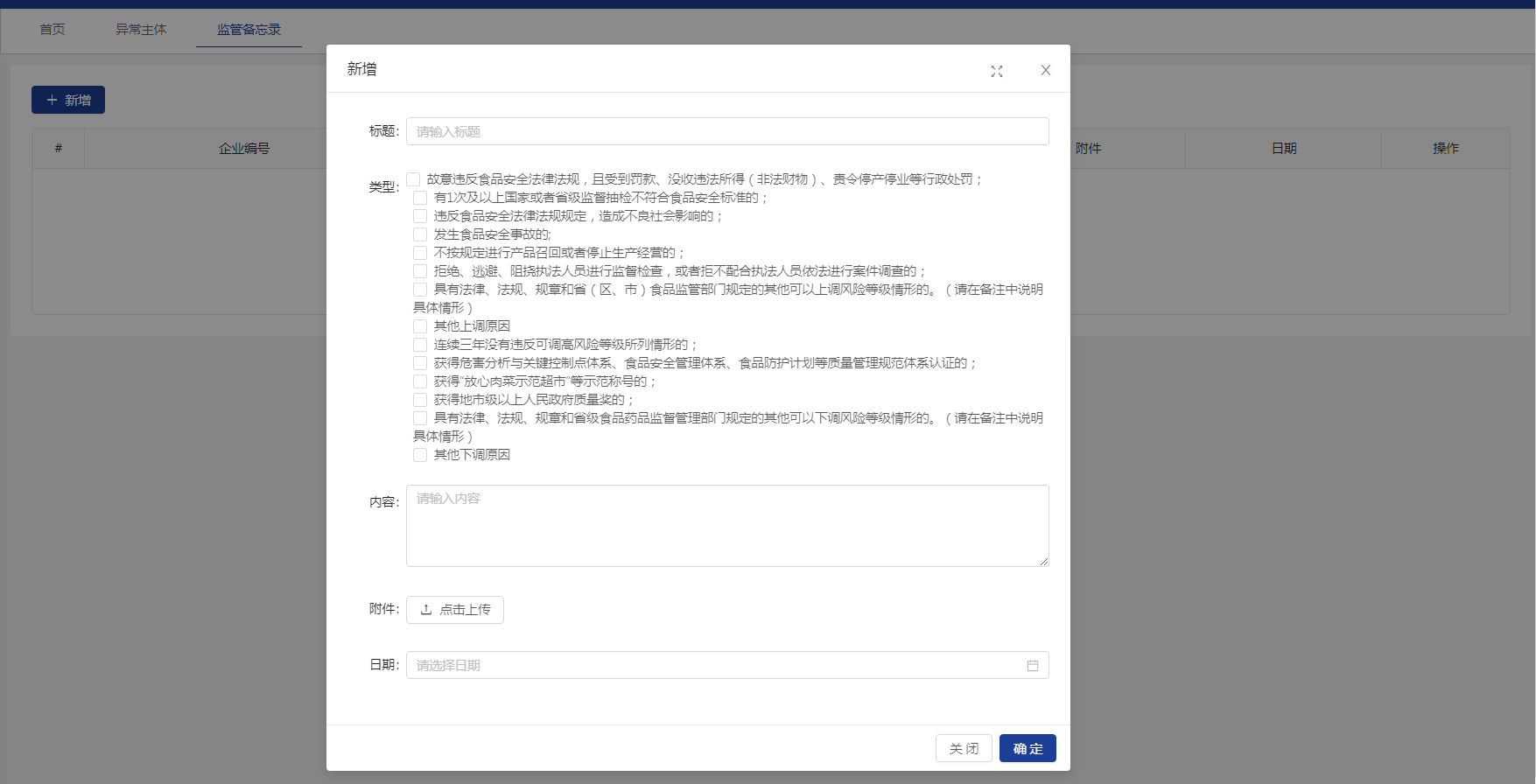 【异常主体】菜单展示所有经营状态异常的企业。同样可以通过监管网格、监管机构、企业名称等来查询。