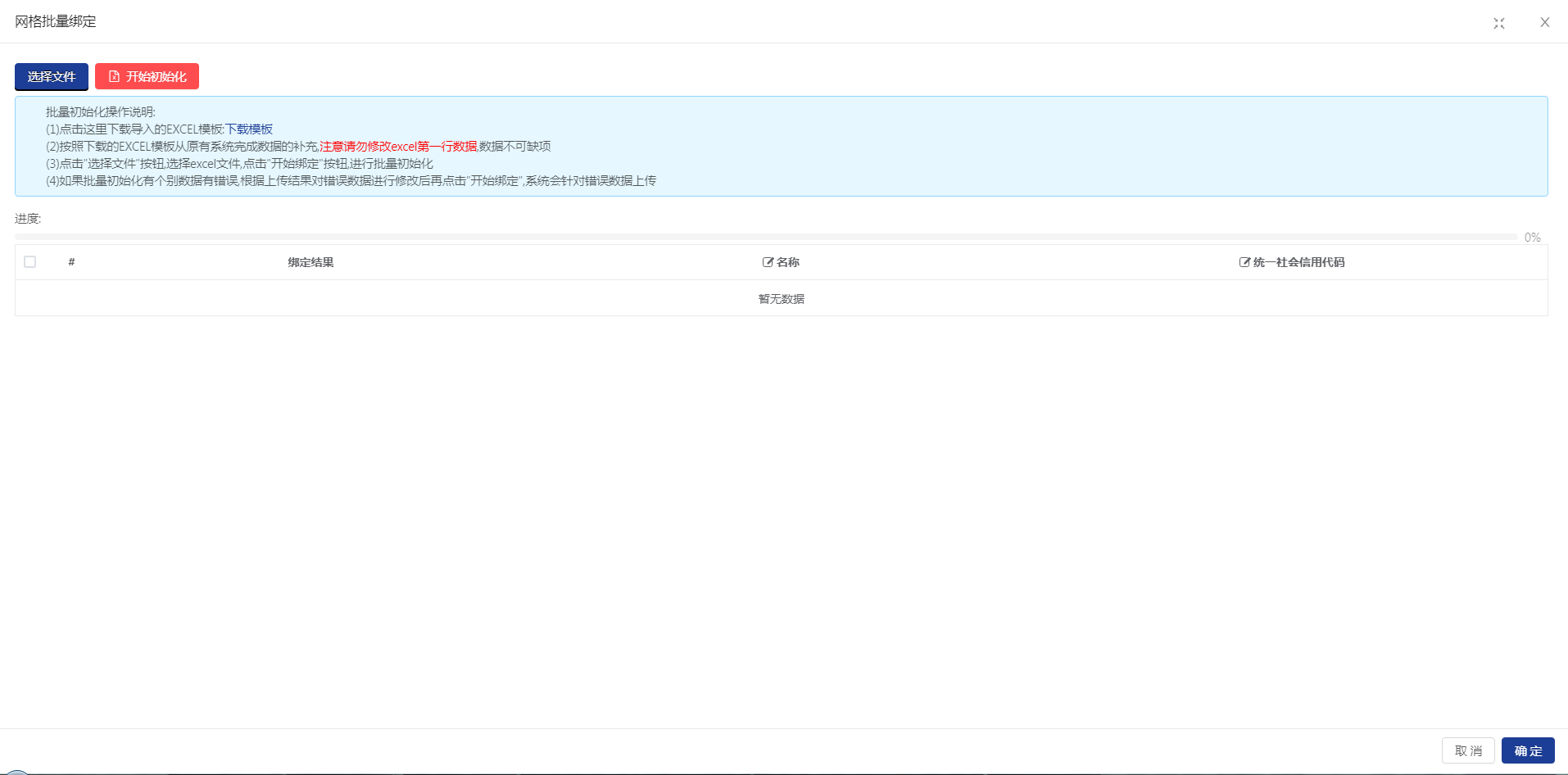 系统也支持为网格组批量导入企业,选择【批量绑定企业】按钮,首先下载导入模板,然后按照要求填写企业相关信息,注意不要修改excel第一行数据且数据不可缺项,填写完成后再点击【选择文件】按钮找到需要上传的文件,最后点击【开始初始化】按钮进行批量绑定,若文件中存在个别数据有误,可以根据上传结果对错误数据进行修改后重新导入,系统会自动针对错误的数据上传。绑定成功后,网格组的监管人员可以对本网格组的企业进行日常监管。