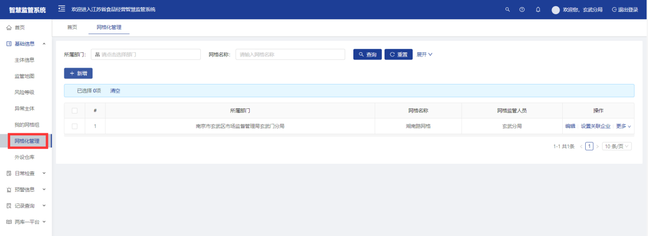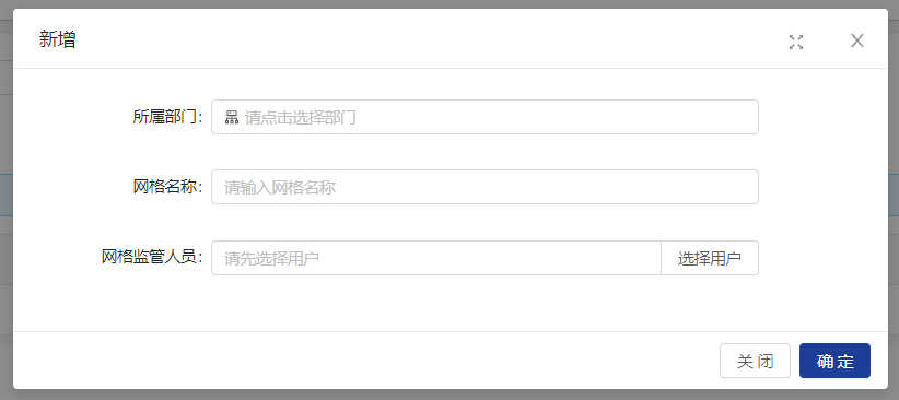 点击【新增】按钮,选择所属部门、网格监管人员、录入网格名称即可添加成功。