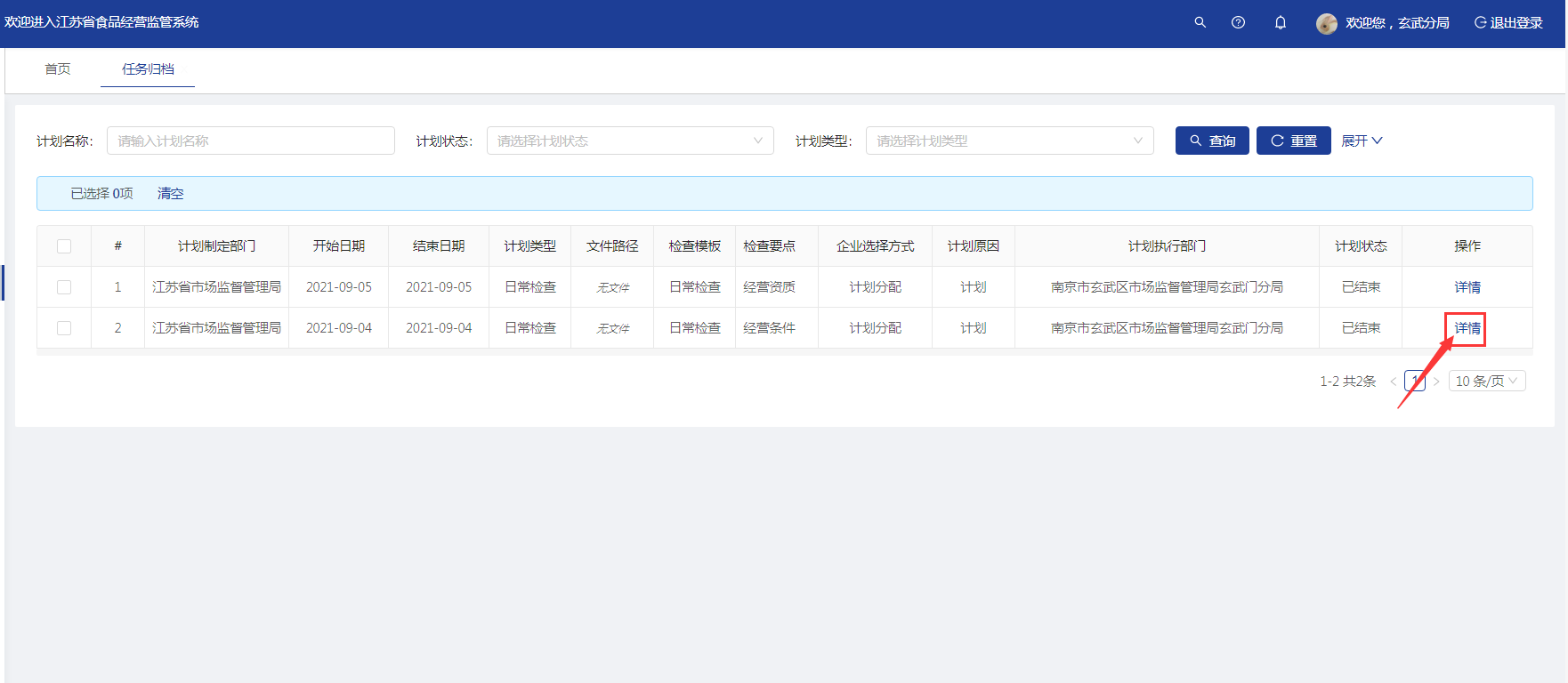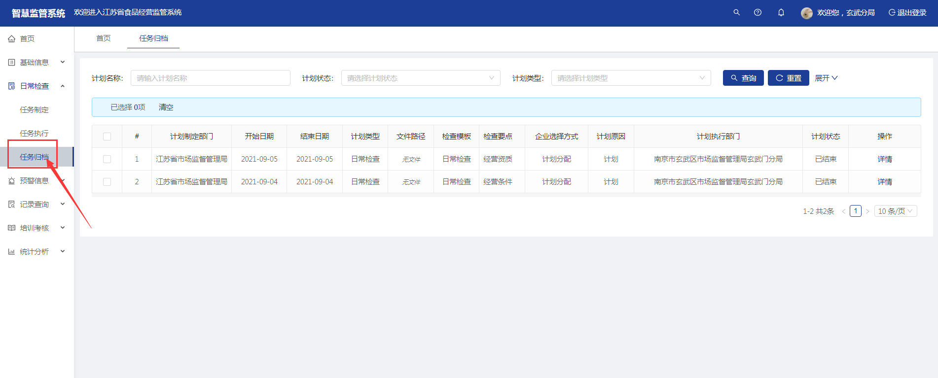 【任务归档】统计所有已完成的计划信息,列表中展示检查结束已归档的计划。