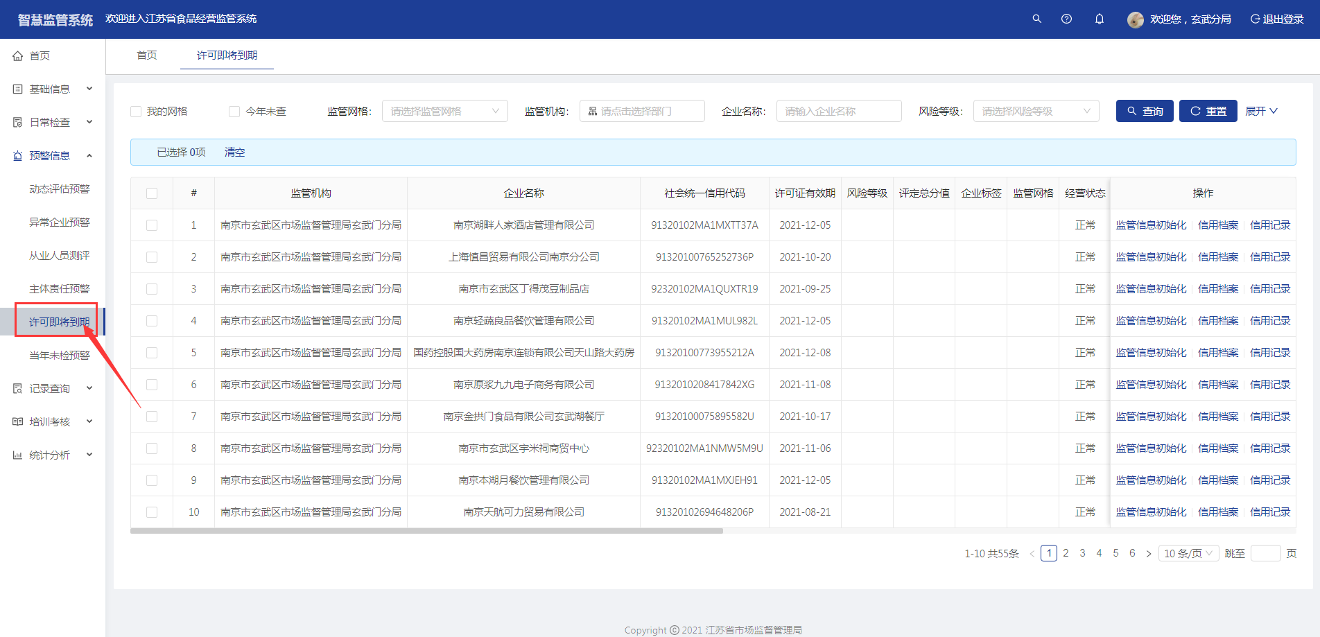 列表最右侧同样拥有【监管信息初始化】、【信用档案】、【信用记录】三个按钮,按钮功能与之前一致。