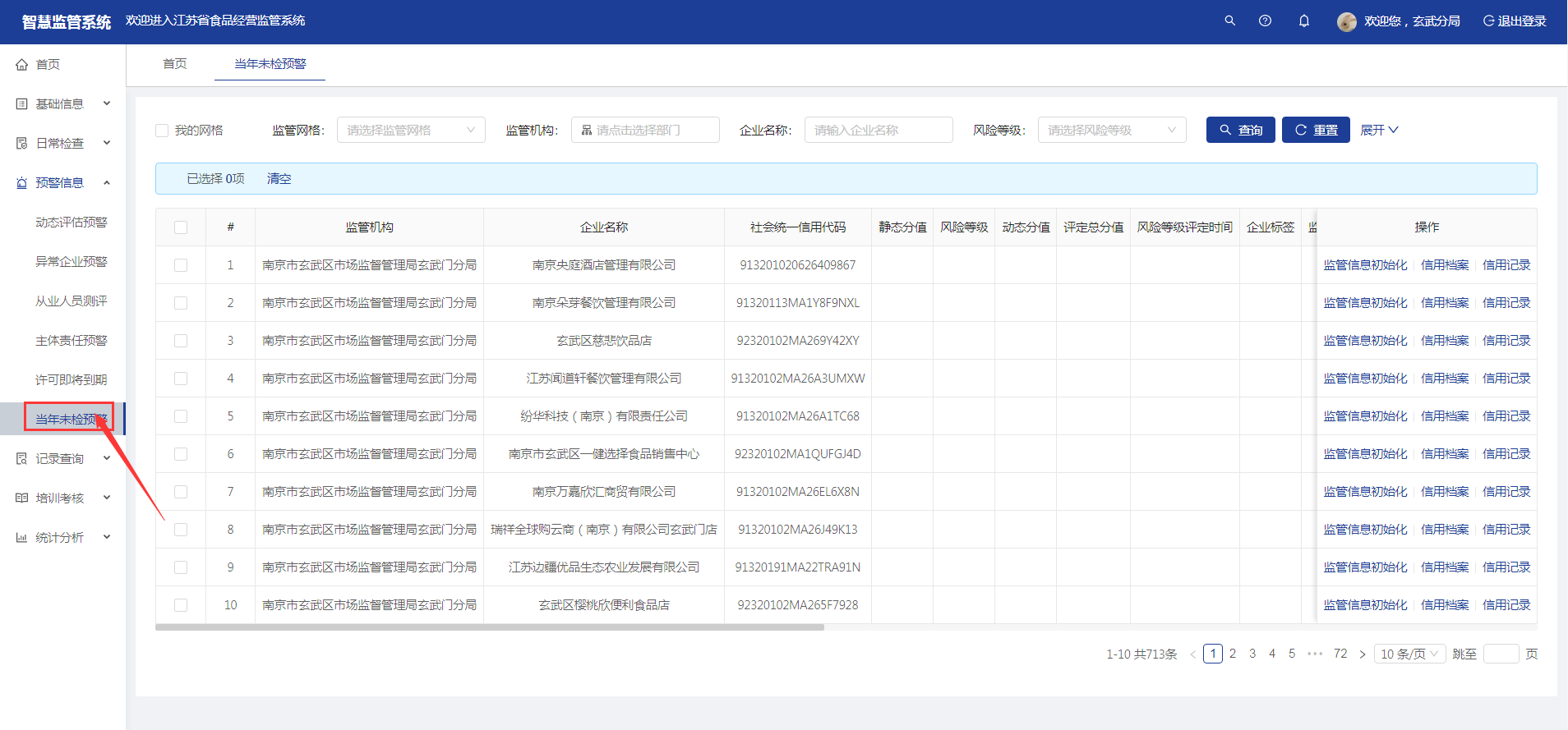【当年未检预警】菜单统计显示当年整个自然年都没有现场检查过的企业信息。可以通过监管机构、监管网格等条件来查询。