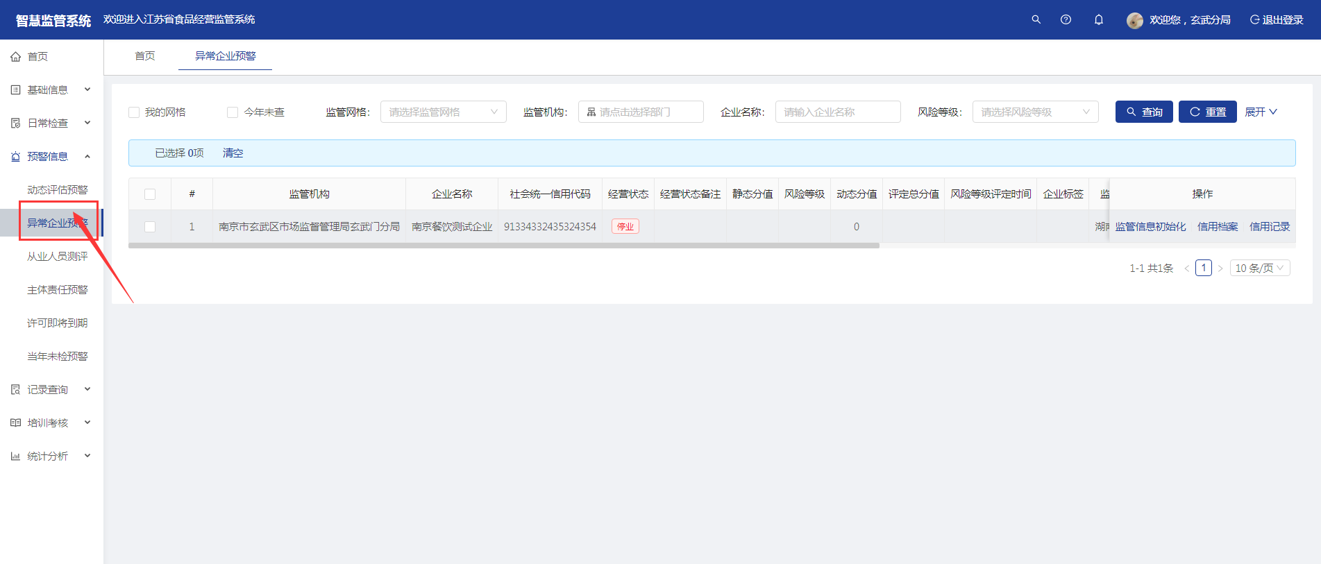 列表最右侧同样拥有【监管信息初始化】、【信用档案】、【信用记录】三个按钮,按钮功能与之前一致。
