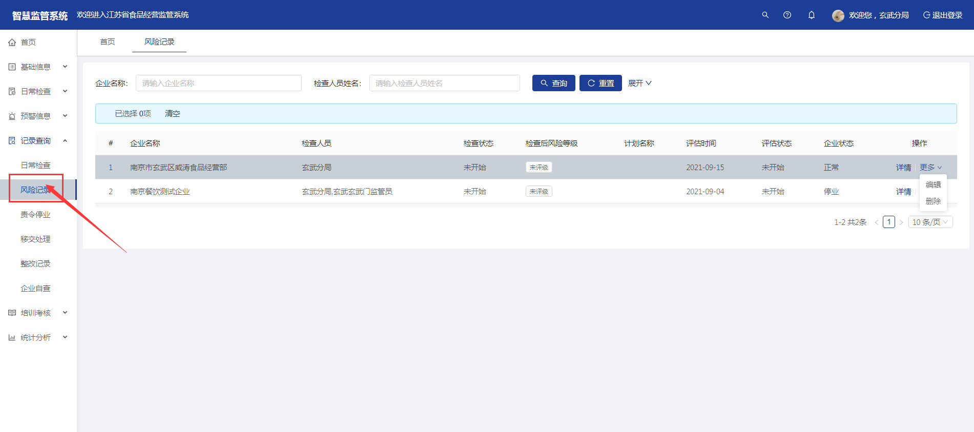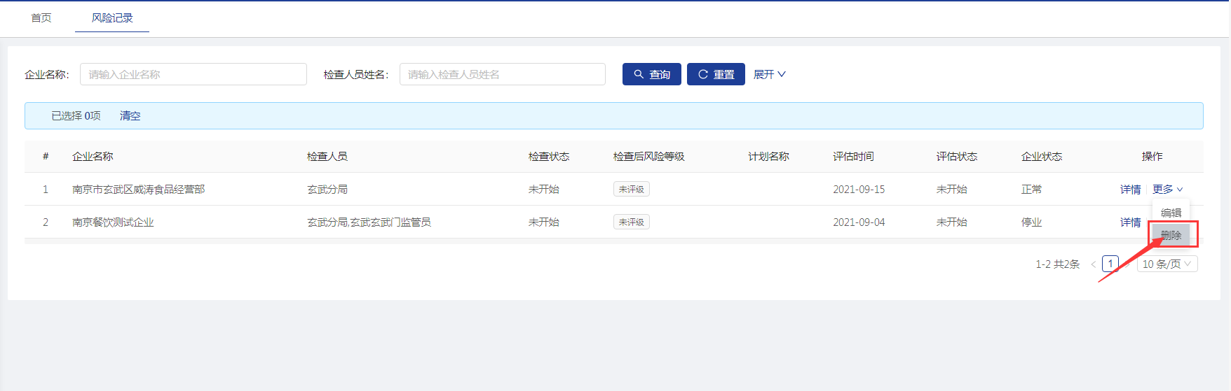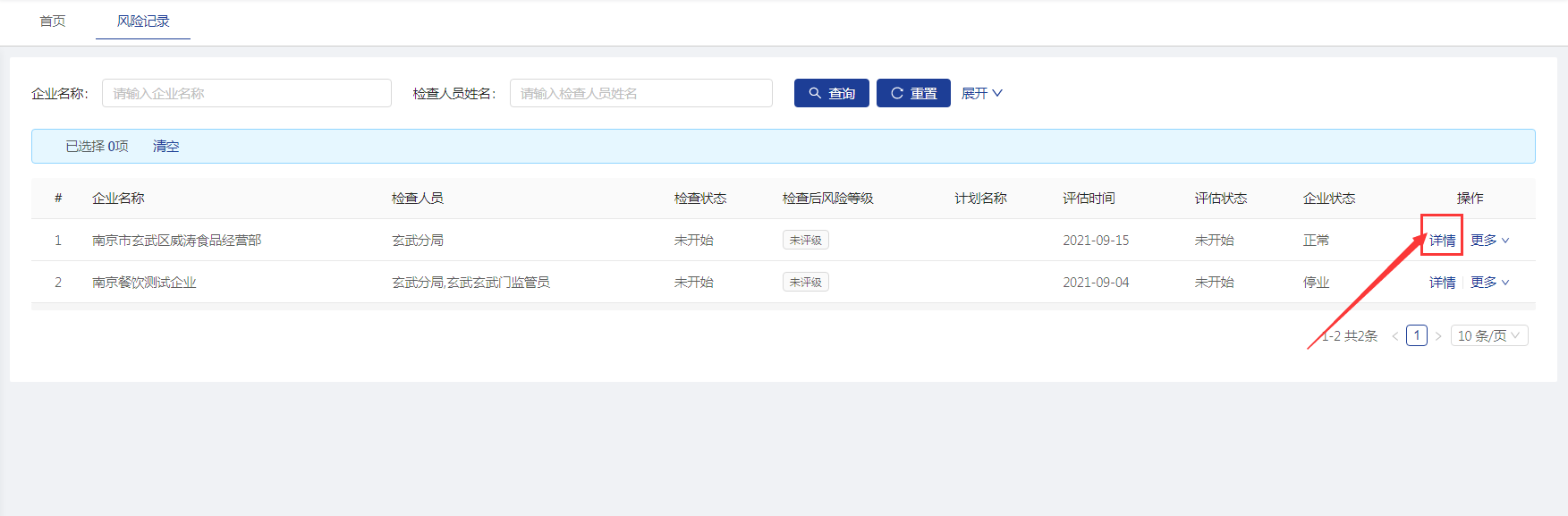 【风险记录】菜单显示所有未评级或评级过存在风险等级的企业信息。