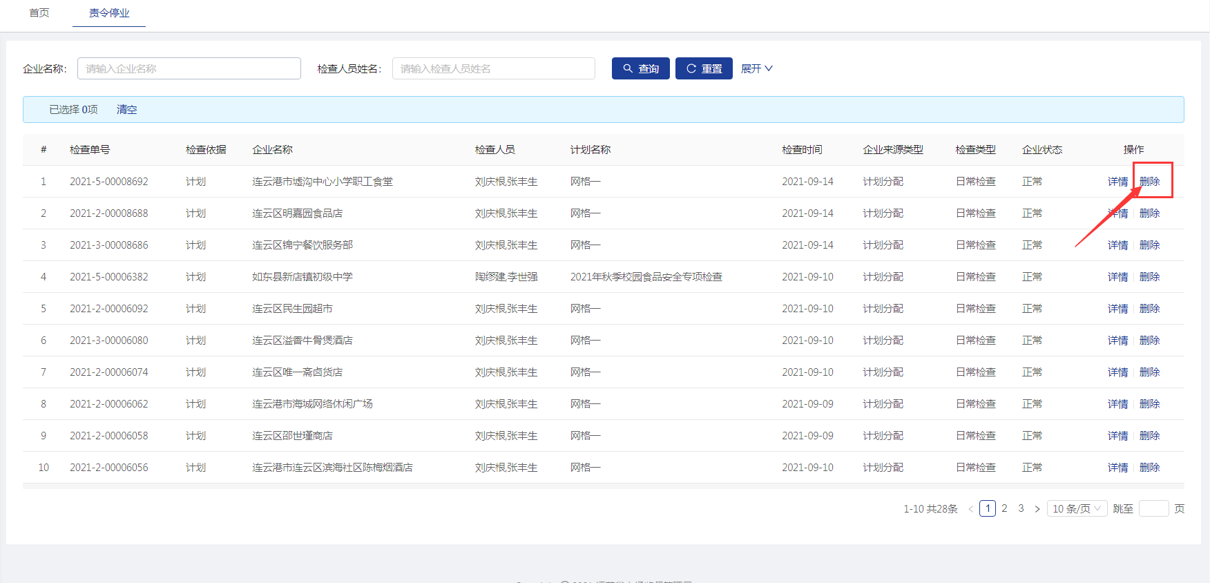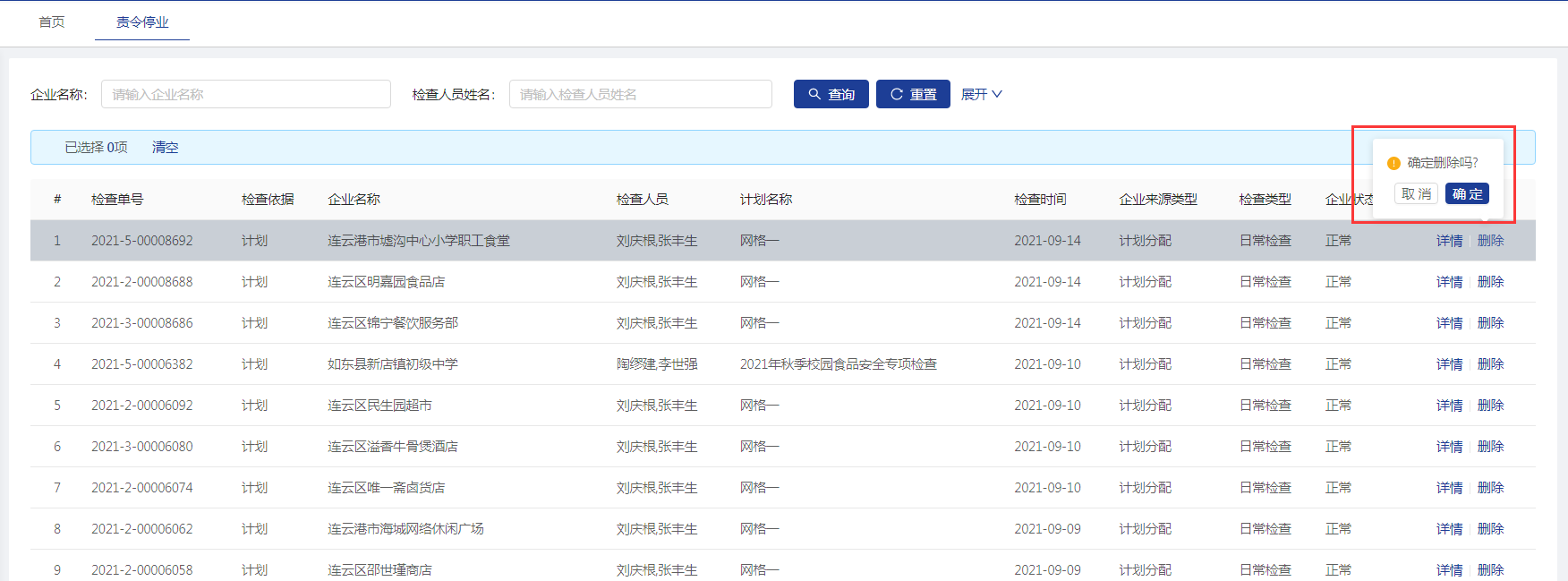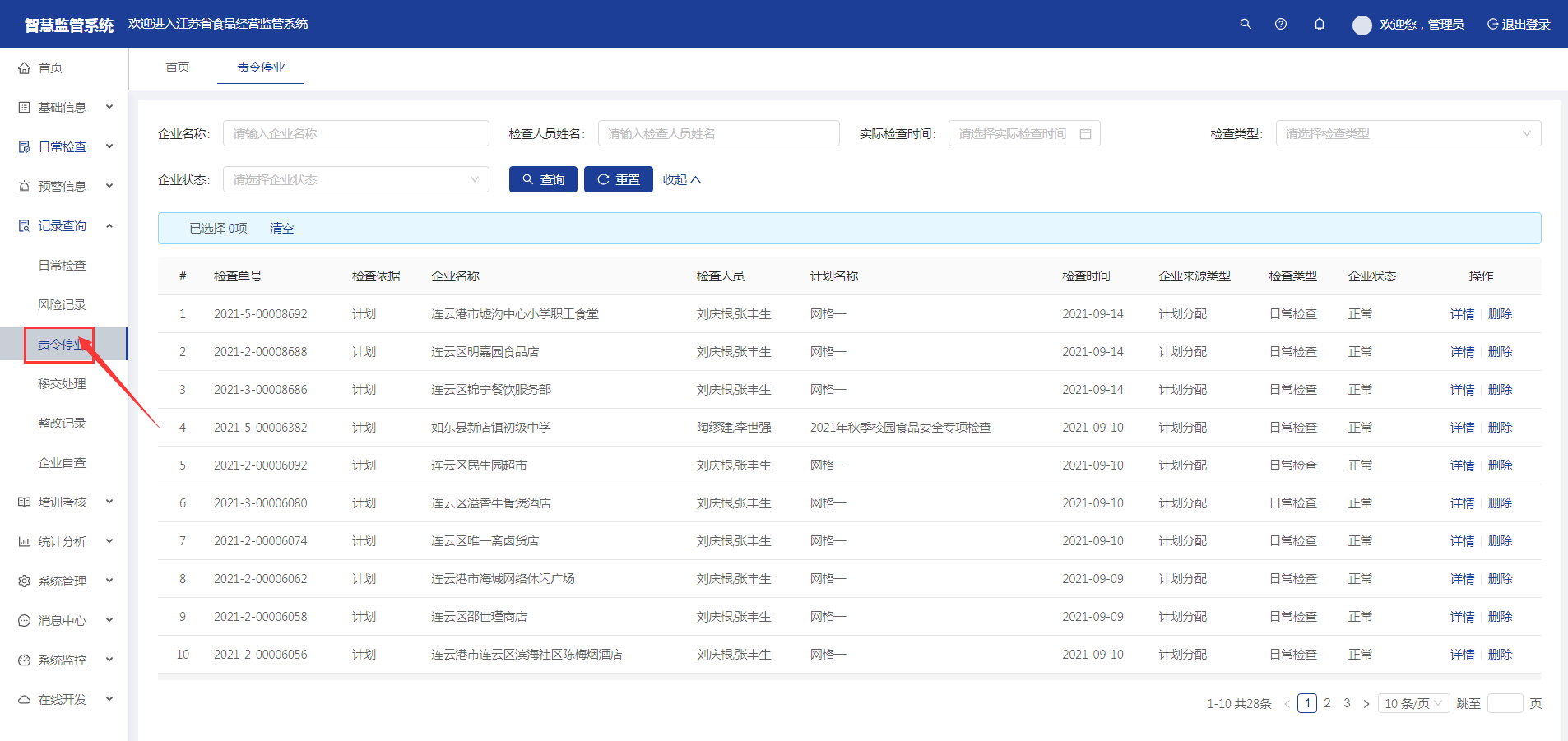 【责令停业】菜单显示所有检查不合格,处理结果选择停业的企业信息。可以通过企业名称、检察人员姓名、实际检查时间、检查类型、企业状态来查询。