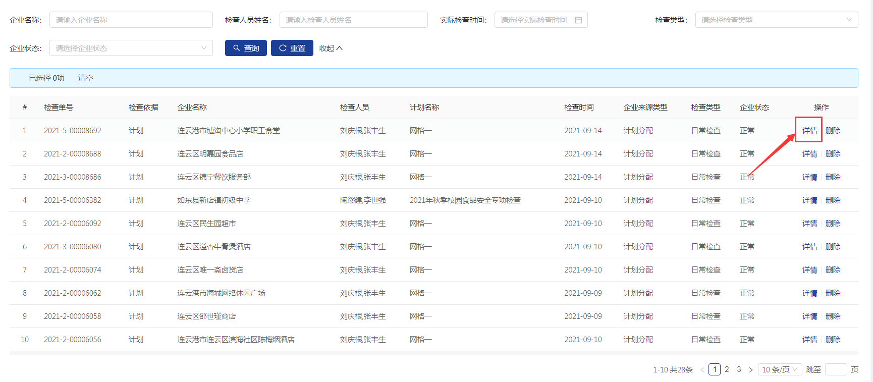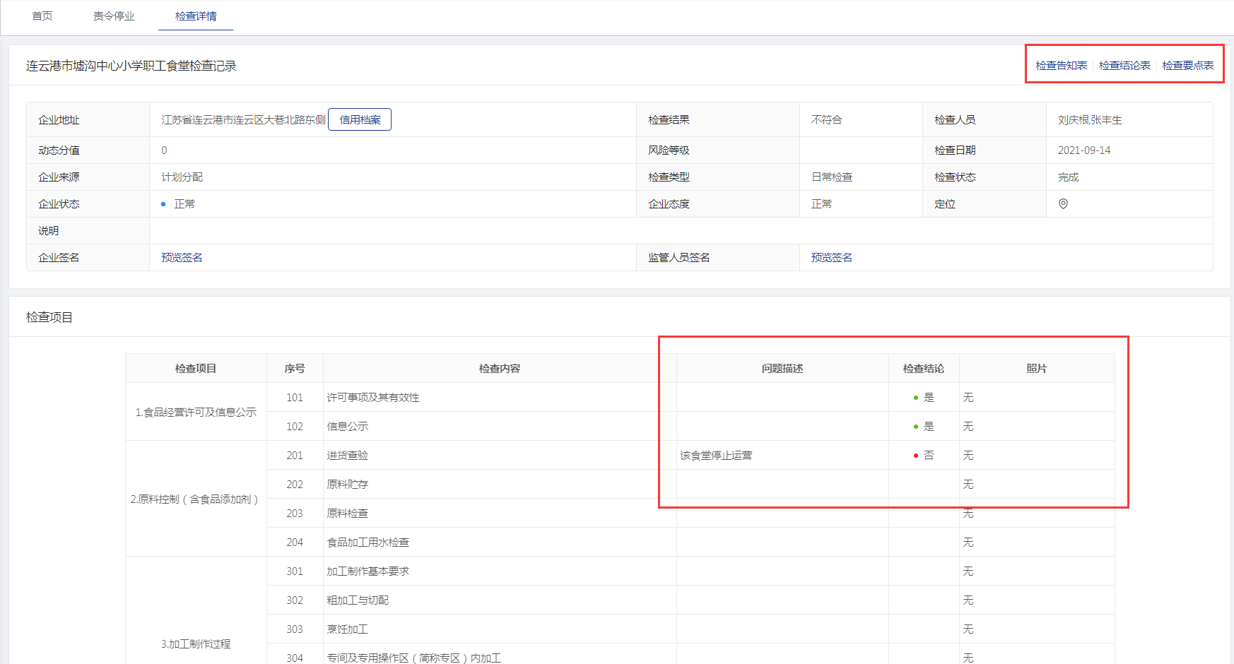 点击【详情】按钮也可以查看企业详细的现场检查记录。