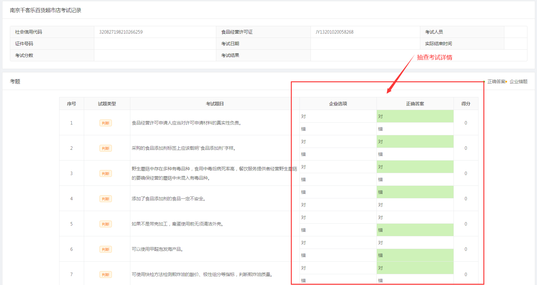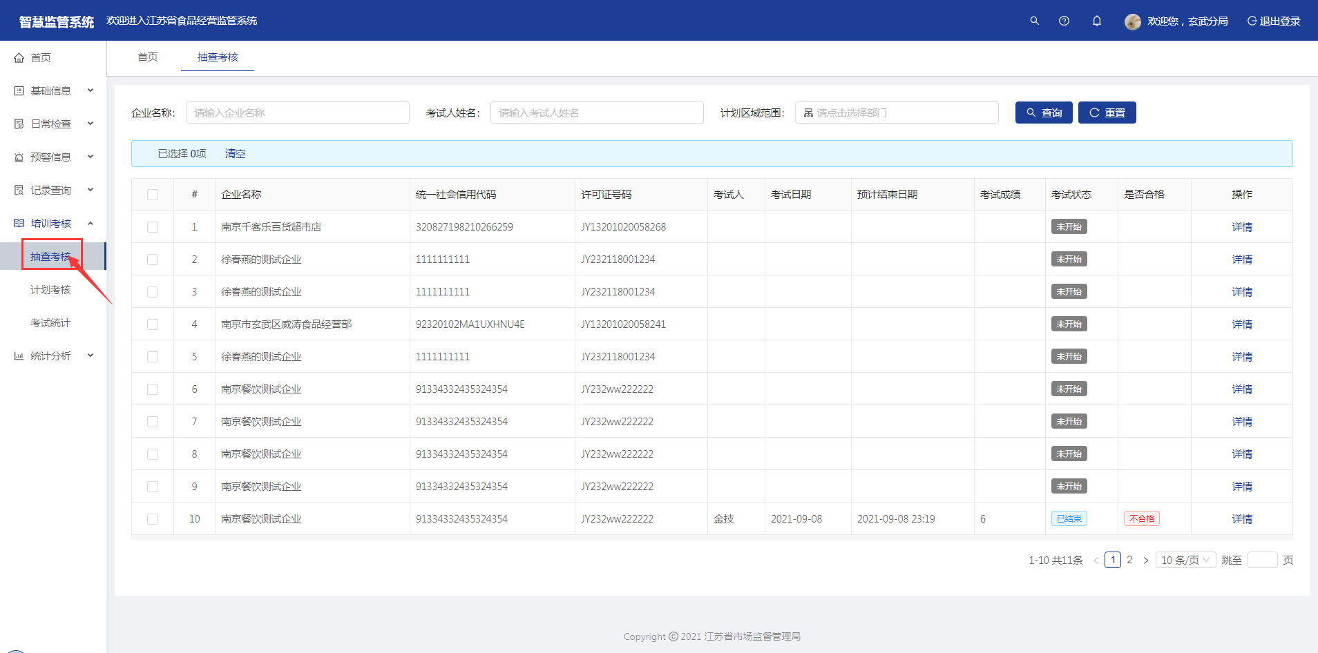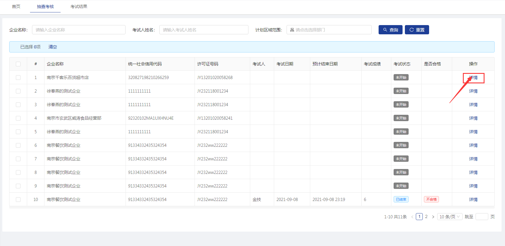 成功发起抽查考核后,监管人员可以在【培训考核】-【抽查考核】看到对企业发起的抽查考核的记录。菜单统计所有进行过抽查考试的企业信息,可以通过企业名称、考试人姓名、计划区域范围来查询需要的信息。