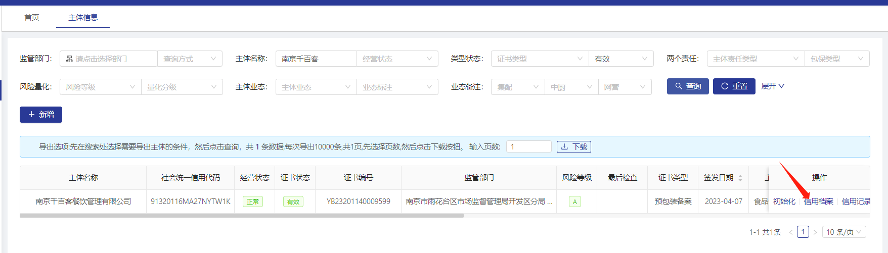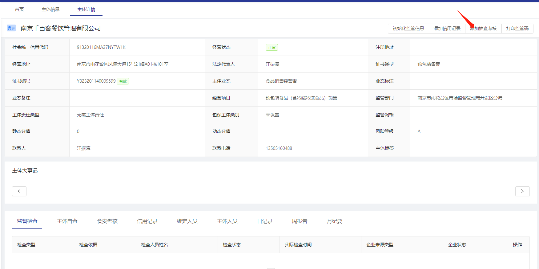 监管人员登录智慧监管系统,进入【基础信息】-【主体信息】中输入需要添加抽查考试的企业名称,查询到企业主体信息后,点击操作下方的“信用档案”进入主体详情菜单页面,点击“添加抽查考核”就可以对企业发起抽考: