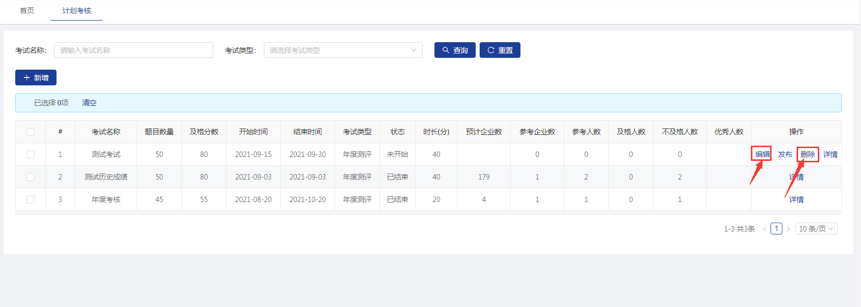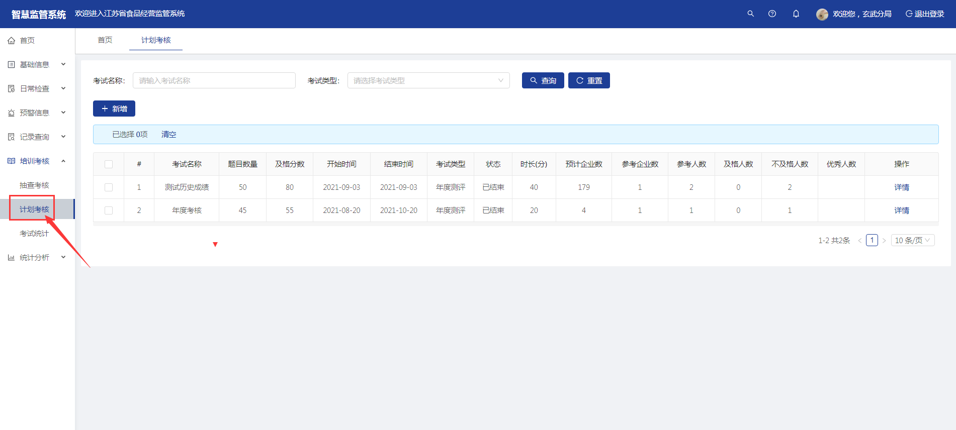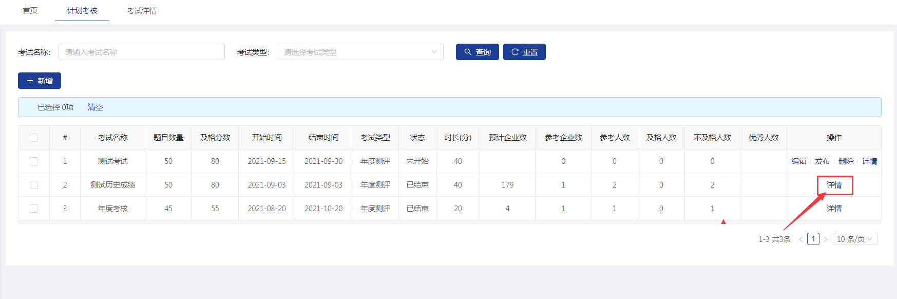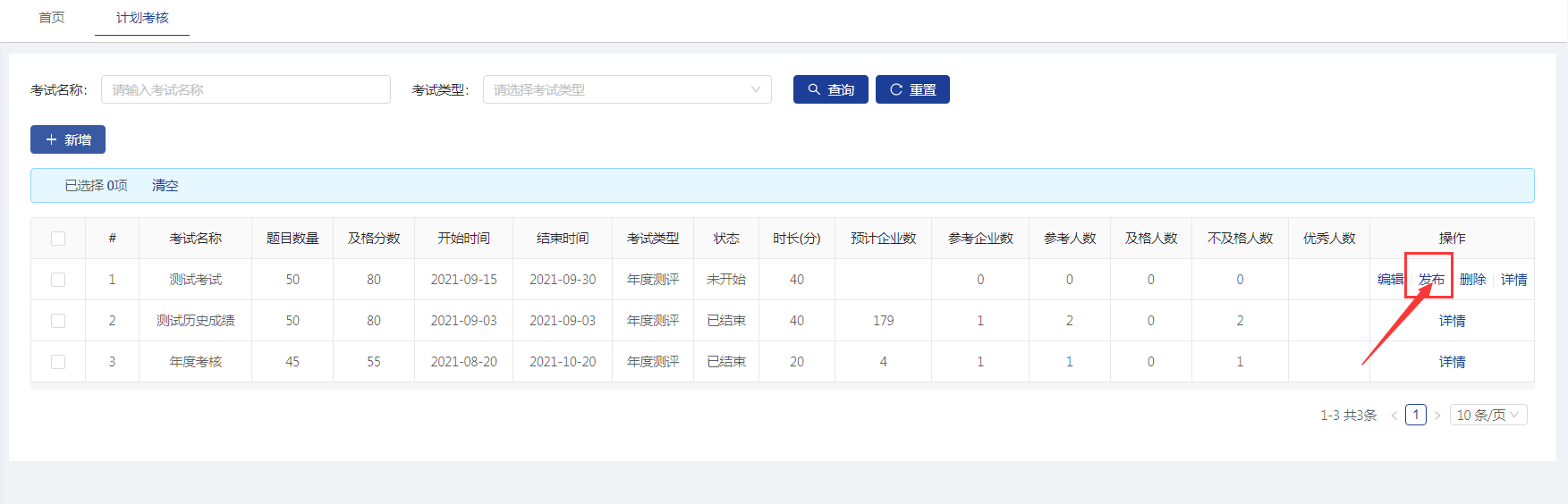 【计划考核】菜单显示添加的所有考试计划信息。可以通过考试名称、考试类型来查询。也可以添加发布新的考核计划。
