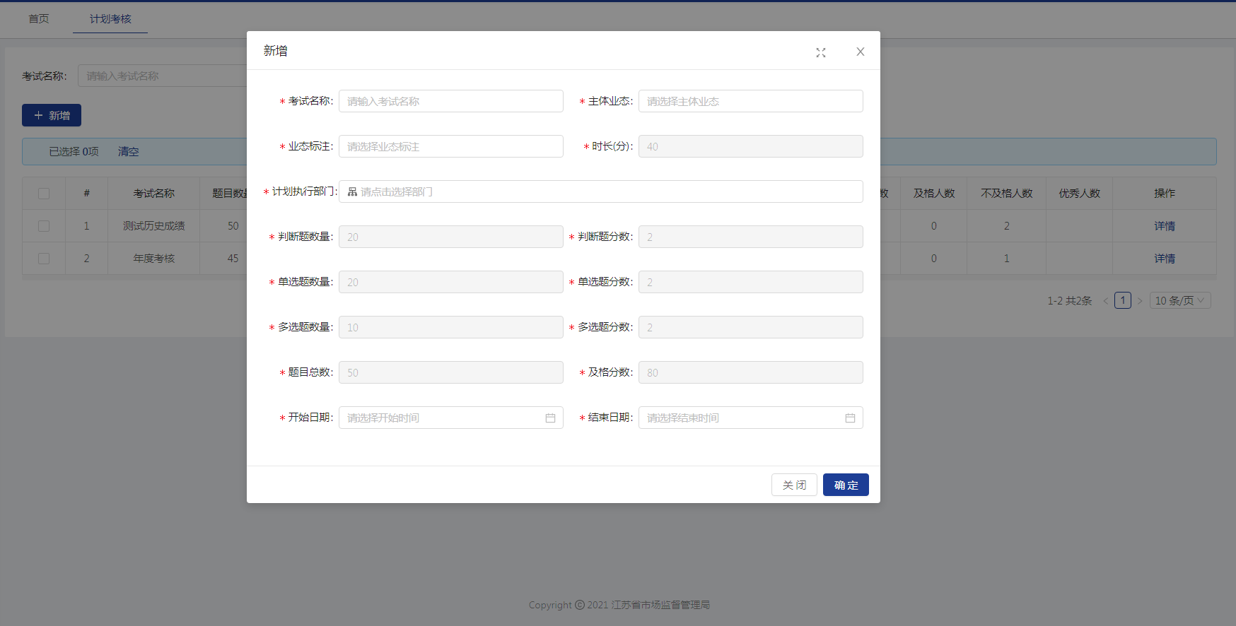 点击【新增】按钮,输入计划相关信息,包括考试名称、主体业态、业态标注、时长、计划执行部门、各种题型的数量和分数,以及开始结束日期。