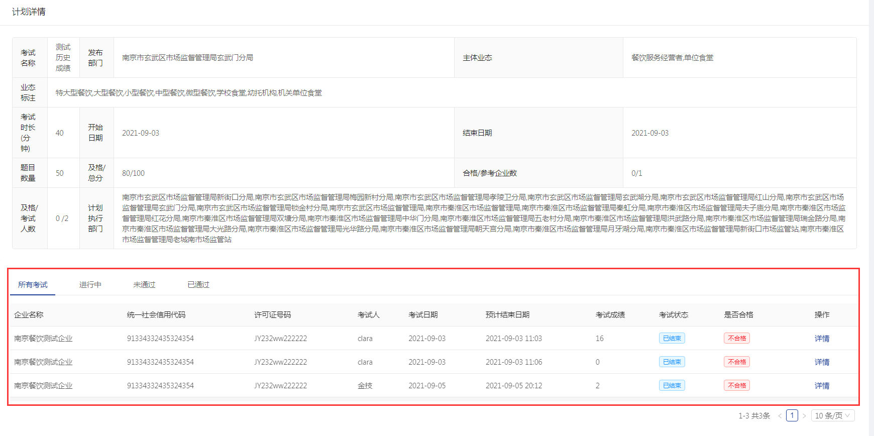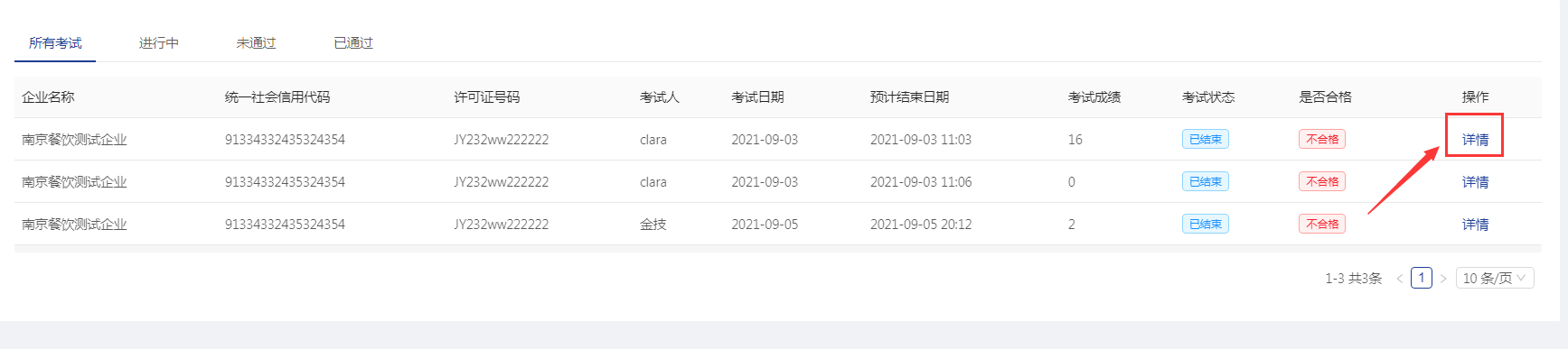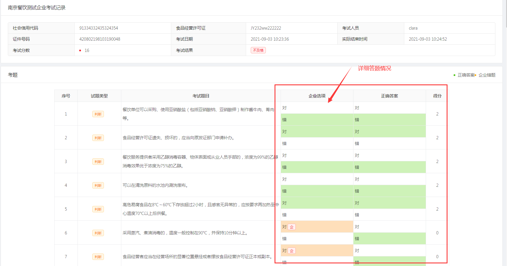 选择需要查看的企业,点击【详情】按钮可以看到具体的答题考试情况。