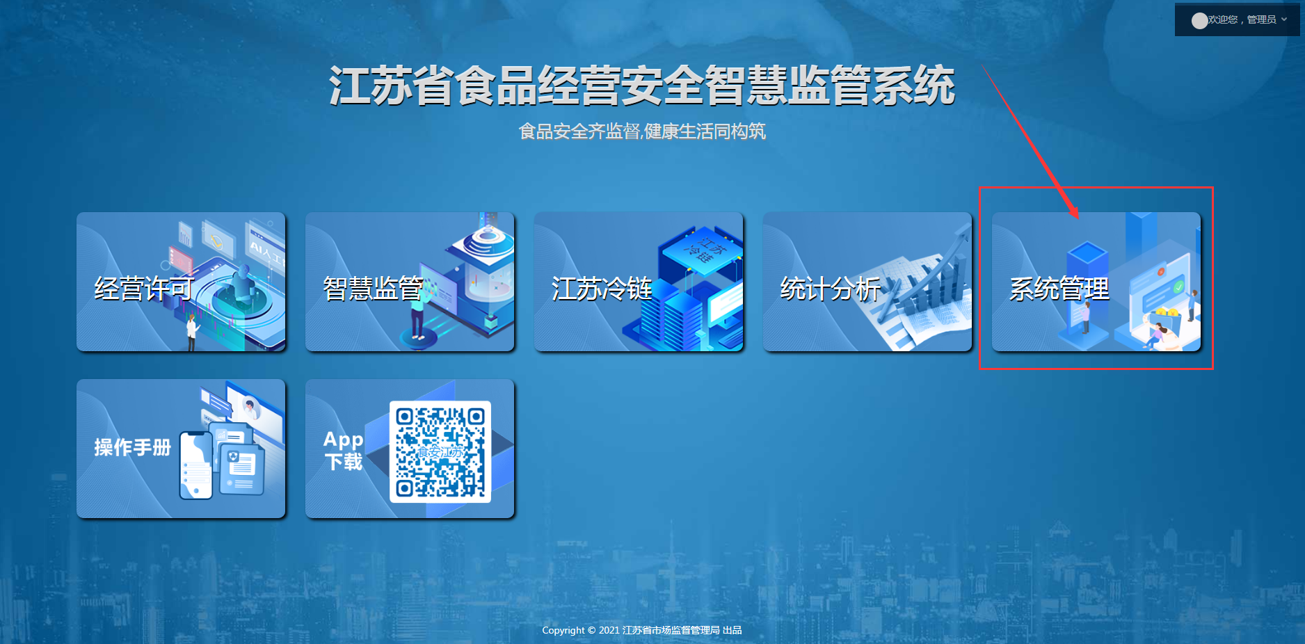使用拥有管理员权限的账号登录系统,选择【系统管理】模块进入。如图: