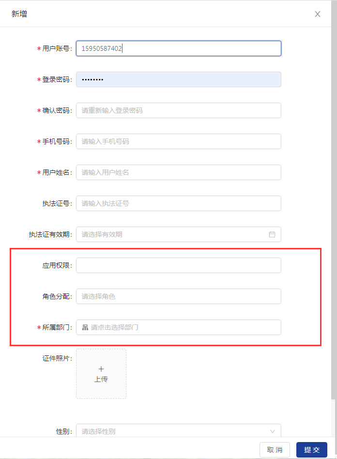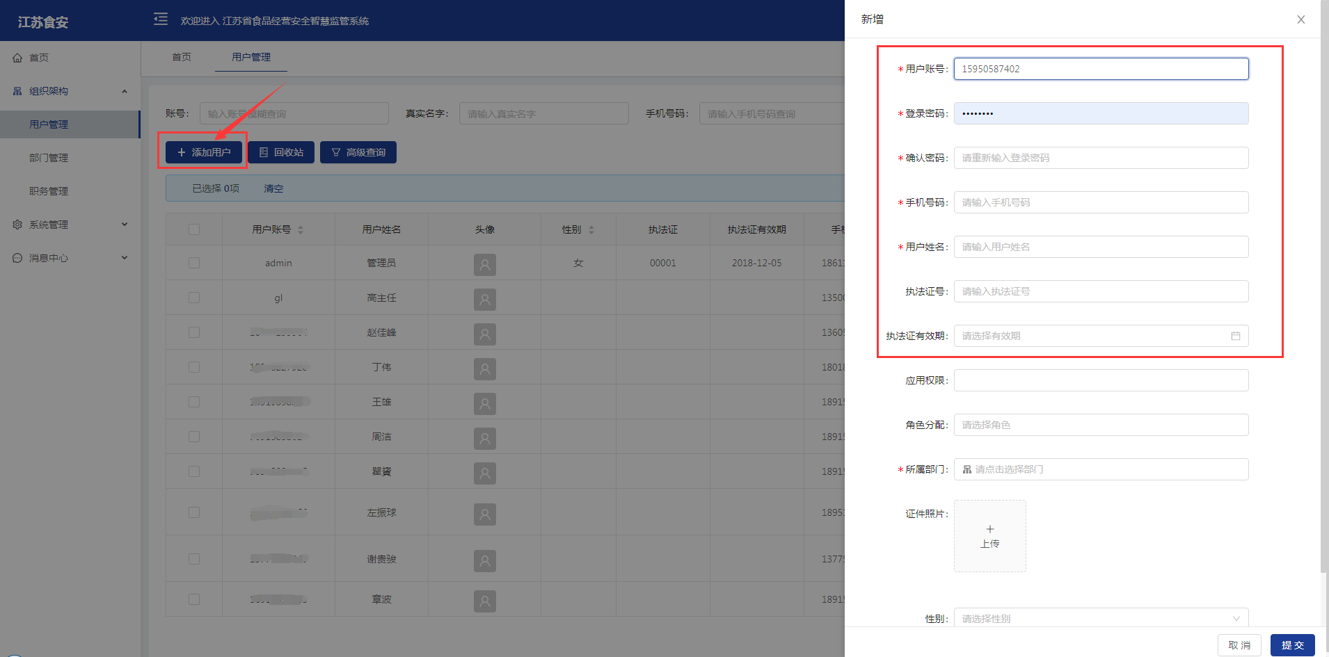 第一步点击左上角【添加用户】按钮,打开账号添加界面,依次录入用户账号、登录密码、确认密码、手机号码、用户姓名,其中用户账号推荐使用个人手机号码,姓名填写真实姓名。若有执法证号的,也需要录入证号以及有效期,方便后续监管报表中展示。如图:
