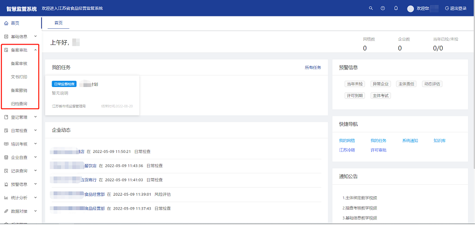 企业通过江苏省食品经营许可证企业端申请备案进行提交,监管人员登录智慧监管平台对企业申请的备案信息进行审核。