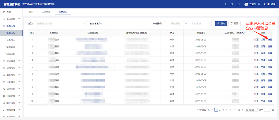 【备案审核】菜单显示提交备案的企业信息,监管人员对企业提交的备案信息进行查看、受理、补正,完成备案信息的审核工作。