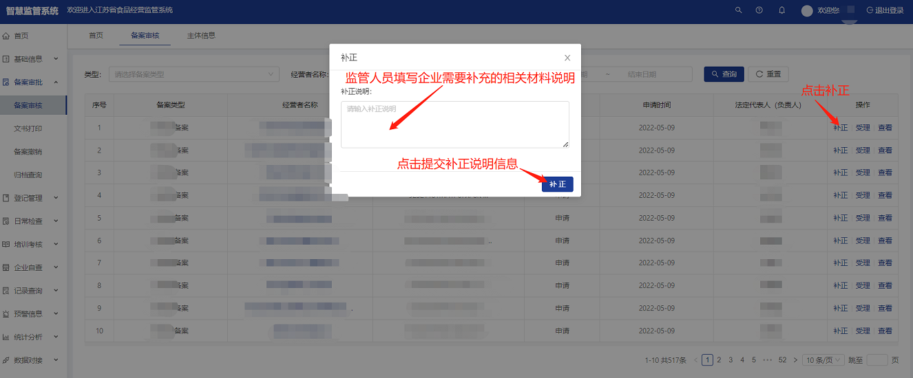 监管人员确认核实企业提交的备案信息,如果核实到有需要企业补充的材料及信息,可以点击【补正】,填写补正相关说明后,点击“补正”,企业端会收到补正信息。