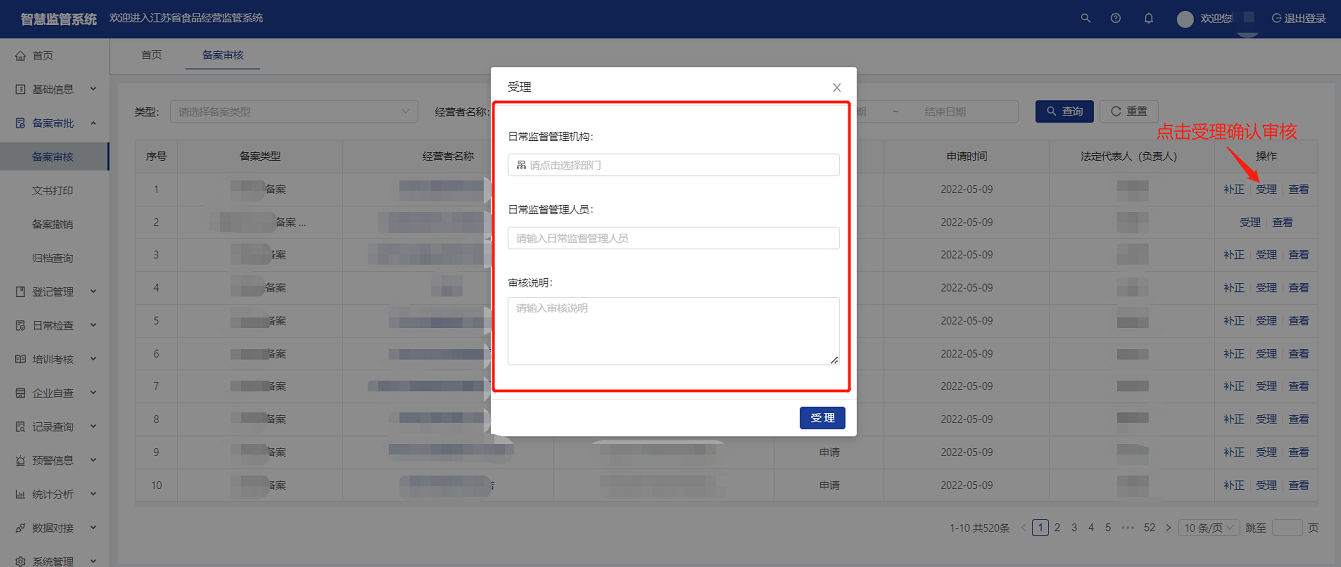监管人员核实企业申请的备案信息确认无误,点击【受理】选择企业对应的日常监管部门、输入日常监管人员信息,填写审核说明,确认提交受理审核。