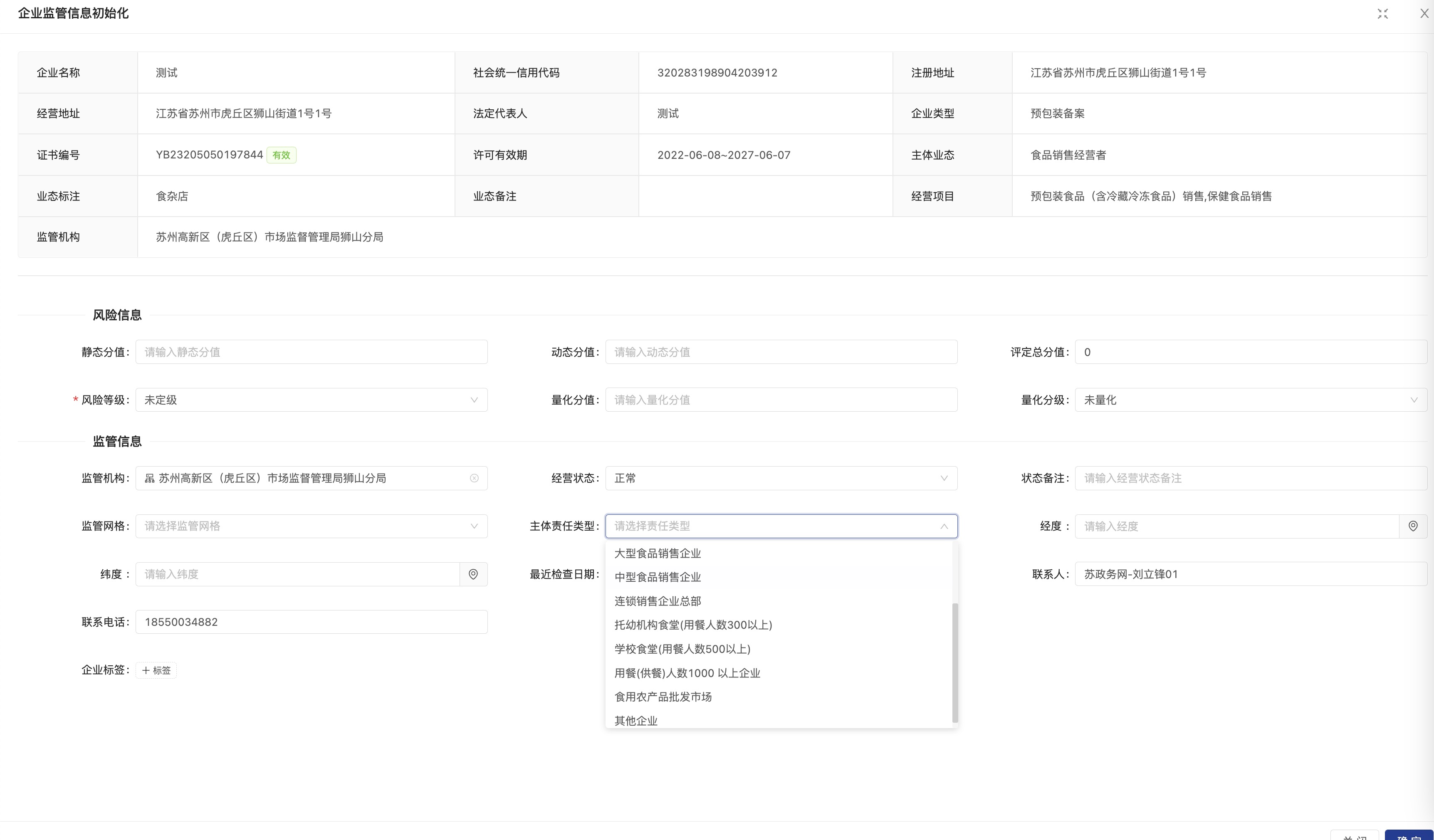 企业操作【主体责任】模块,首先需要修改企业的基本信息,在企业的基本信息里面设置企业的【主体责任类型】,其中只有“其他”类型的企业不需要设置食品安全总监,其他类型的企业都需要设置食品安全总监。