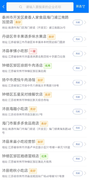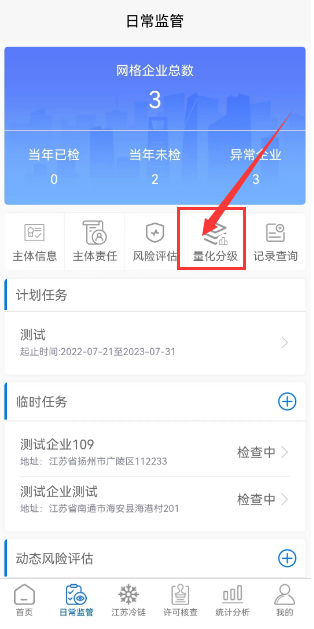 4.【量化分级】菜单展示所有企业量化分级检查的完成情况,若状态是未开始,点击企业名称可以直接发起量化分级检查,若状态是已完成,点击企业名称可以查看量化分级检查记录。
