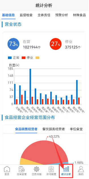 监管人员点击下方【统计分析】菜单,进入统计分析模块。包括基础信息、监督检查、主体责任、预警分析、特殊食品、培训考核等各种统计。