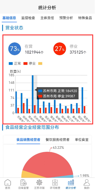 点击【基础信息】页签,可以看到营业状态统计,统计正常营业企业的百分比以及停业企业的百分比。还分别统计了省内十三个地市的正常企业数量和停业企业数量。