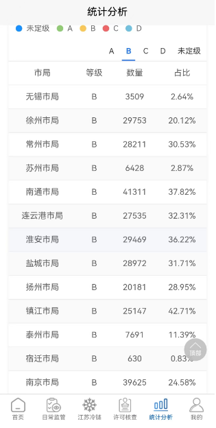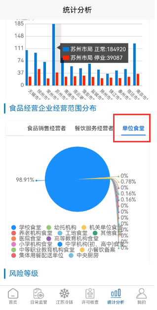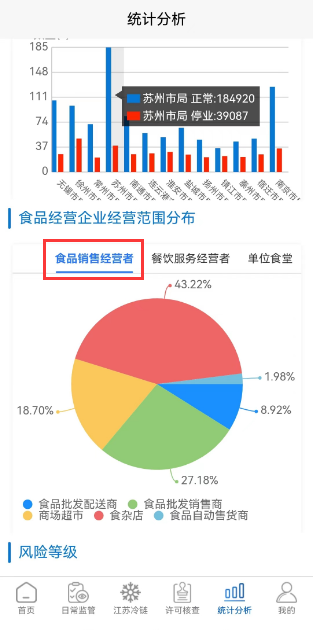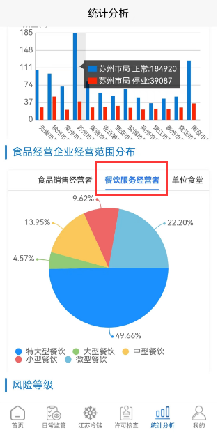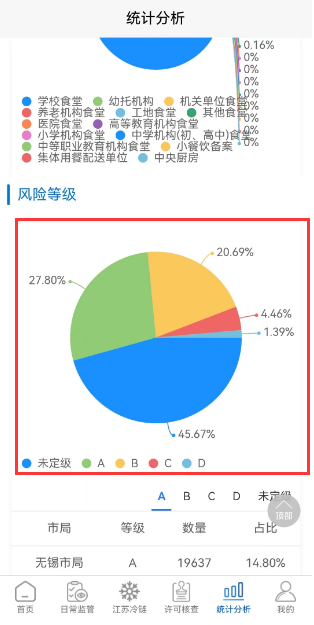 风险等级统计展示了五种等级的占比情况(A、B、C、D、未定级),以及十三个地市各风险等级的企业数量和占比。