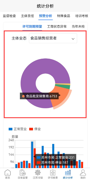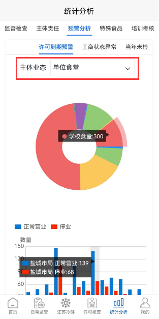 许可到期预警可以根据主体业态来查询,选择食品销售经营者,可以看到销售类下的各业态标注企业许可到期占比数量,各地市销售类许可到期企业正常营业家数和停业家数,以及具体的销售类许可到期企业名称和许可有效期等。