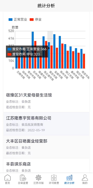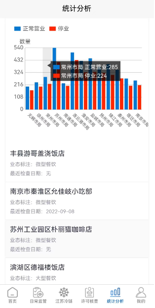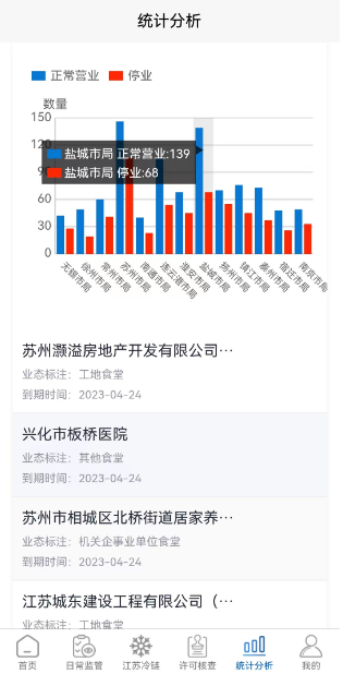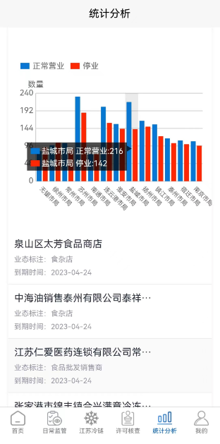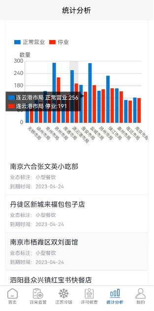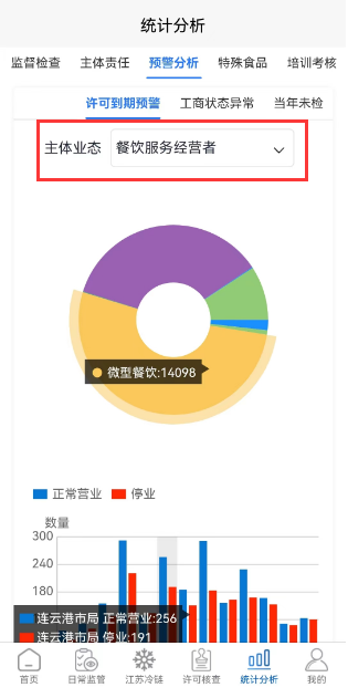 选择餐饮服务者,可以看到餐饮类下各业态标准企业许可到期占比数量,各地市餐饮类许可到期企业正常营业家数和停业家数,以及具体的餐饮类许可到期企业名称和许可有效期等。