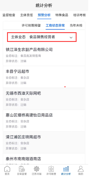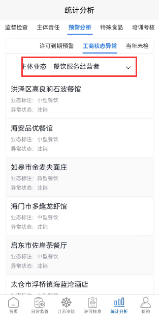 工商状态预警也可以通过主体业态查询,分别查询显示食品销售经营者、餐饮服务经营者、单位食堂的工商状态异常企业名称、业态标注和状态等信息。