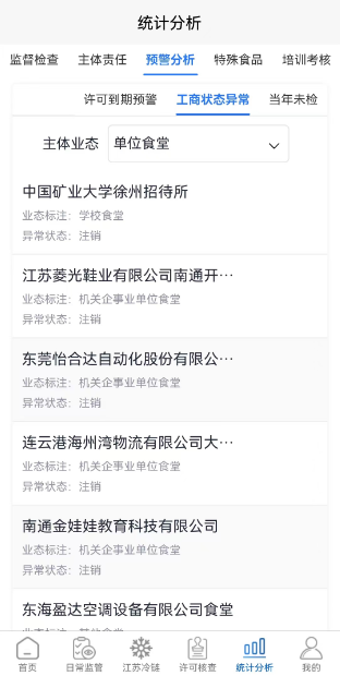 点击【预警分析】页签,可以分别查看许可到期预警信息、工商状态异常预警信息以及当年未检预警信息。