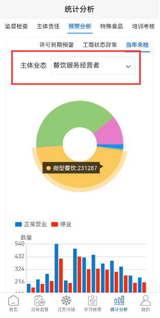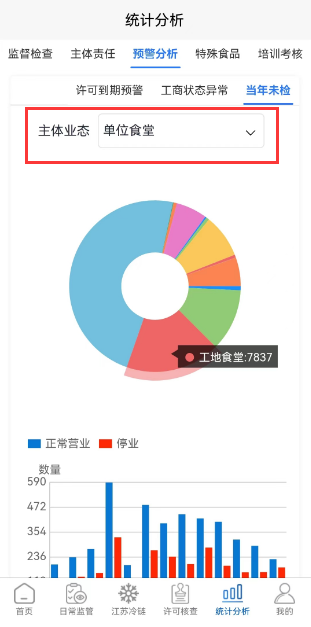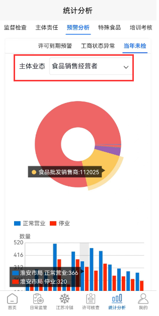 当年未检预警通过主体业态的查询,分别展示食品销售经验者、餐饮服务经营者、单位食堂的各业态标注企业当年未检占比数量、各地市当年未检企业的正常营业家数和停业家数,以及具体的当年未检企业名称和最近检查日期等。