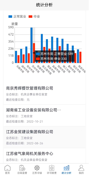 选择单位食堂,可以看到食堂类下各业态标准企业许可到期占比数量,各地市食堂类许可到期企业正常营业家数和停业家数,以及具体的食堂类许可到期企业名称和许可有效期等。