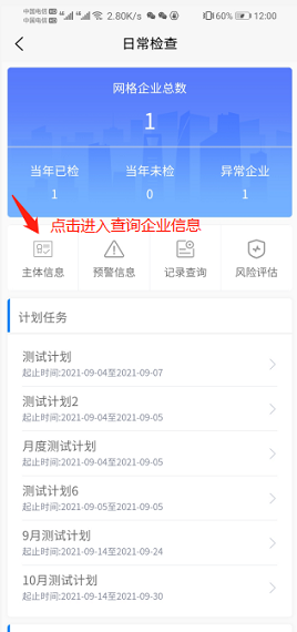 1.【主体信息】显示所在本区域所有的企业数据,点击【主体信息】菜单,进入主体信息列表界面,每家企业还记录当年应检次数和年检次数。
