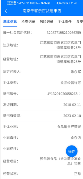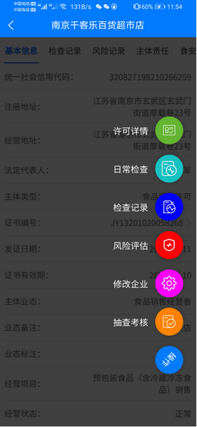 1.1点击企业名称,可以看到企业的基本信息,检查记录、风险记录、主体责任以及食安考核信息。