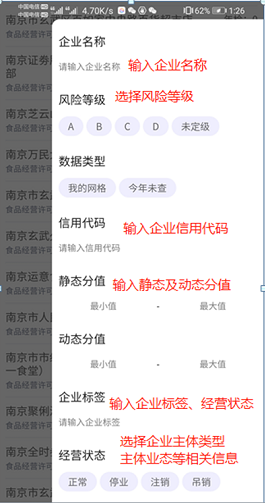 1.3【筛选】功能:点击“筛选”,可以通过填写或选择“企业名称”、“风险等级”“数据类型”、“信用代码”、“静态分值”、“动态分值”、“企业标”、“经营状态”“主体类型”、“证书编号”、“主体业态”、“业态备注”、“业态标注”等字段信息,方便快速准确地查询不同类别的企业信息: