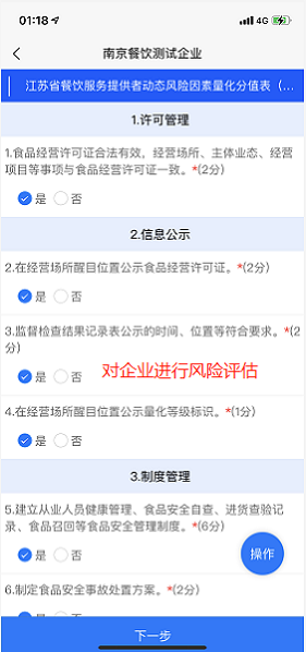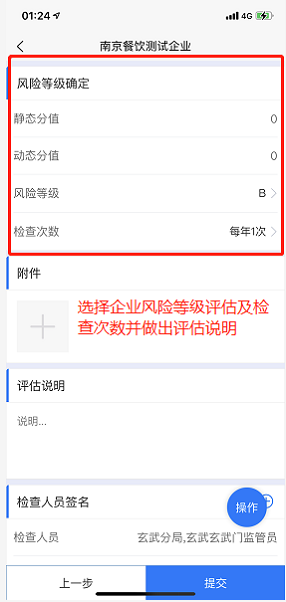 【第三步】对企业风险等级确定,写明评估说明,检查人员签字提交评估结果。