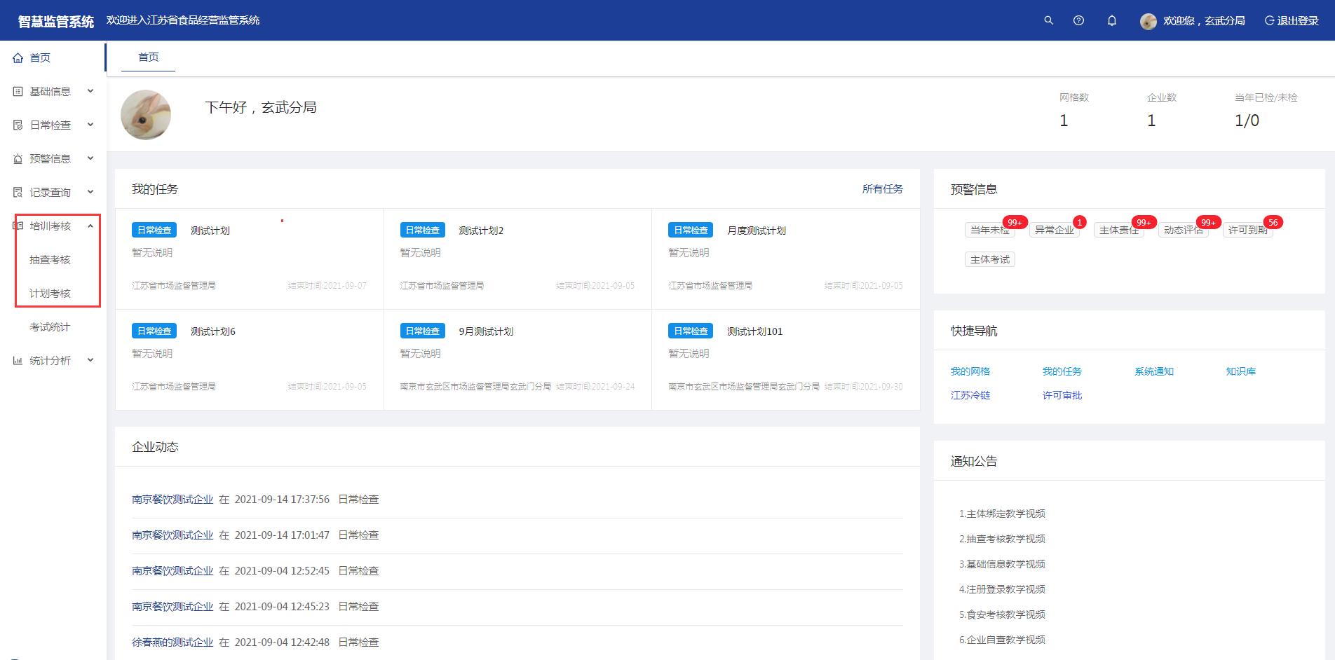 系统建立知识库+题库+考试平台的两库一平台框架,可以展开对企业食品安全管理人员的测评考试。提升企业管理人员专业知识水平。培训考核模块主要包括抽查考核以及计划考核两部分。
