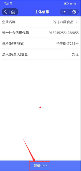 如需更改企业信息,可点击【主体登记】-【解绑企业】,撤回企业资质的信息并重新对企业进行填写,如图: