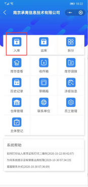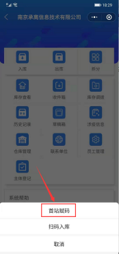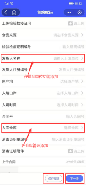 点击【入库】,选择【首站赋码】,填写相关信息,若未添加仓库信息,点击【首站赋码】后会提示还未建立仓库,入库信息填写完成可选择保存到草稿或进行下一步,如图: