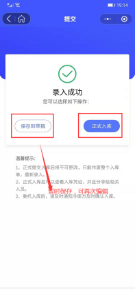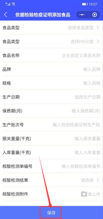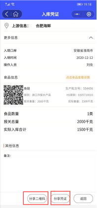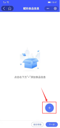 点击【下一步】,系统提示录入食品信息,点击加号,进入食品信息录入界面,填写好相关信息,点击【保存】,界面提示正式入库或保存到草稿箱,若选择正式入库,则生成入库凭证和入库信息二维码,可分享打印。