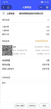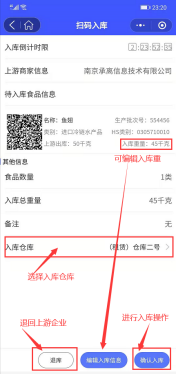 点击【入库】,选择扫码入库,扫描上游公司提供的入库凭证二维码(上游公司出库若超过三天,则无法入库),自动读取上游公司信息及货物信息,可以编辑入库重量,选择入库仓库,点击【确认入库】进行入库操作,也可以点击【退库】将货物退回上游公司,如图: