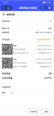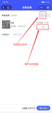 点击【出库】,选择出库类型为【自用出库】,进入出库界面,点击加号,选择出库商品信息或扫入库凭证二维码添加商品(已选中的商品信息可长按删除),输入出库数量,点击【确认出库】,完成出库,如图: