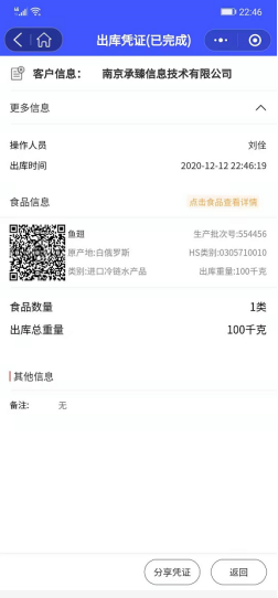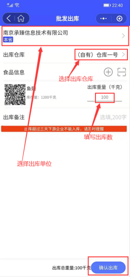 点击【出库】,选择出库类型为【批发出库】,选择出库单位(出库单位信息在【联系单位】功能添加)或扫食品经营企业的监管码添加,依次选择出库仓库、添加食品信息、填写出库数量和备注,点击【确认出库】。