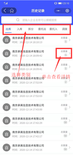 点击【历史记录】,在头部菜单栏中选择需要查看的类别,在类别中点击某一条数据可查看详情。如图: