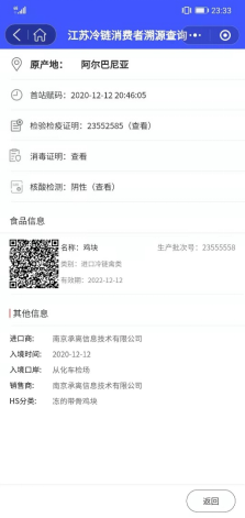消费者可通过溯源扫码功能,扫描商品零售出库二维码,查看该货物出入库时间、进口商、厂家等详细信息。