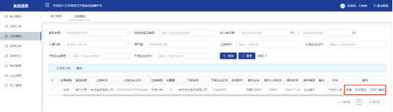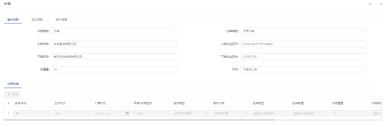 出库查询可根据食品来源、检验检疫证编号、出入库日期、原产国、入境口岸、上下游企业证件、上游名称、下游企业编号等条件查询出库交易详情。